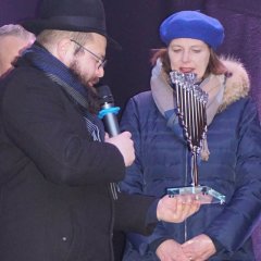 Zu sehen sind die Menora mit den angezündeten Kerzen vor der Teilnehmerinnen und Teilnehmern des Chanukkafestes auf historischen Marktplatz in Oberursel, zum anderen Rabbiner Shalom Dovber Rabinovitz im Publikumsgespräch mit Bürgermeisterin Antje Runge sowie Arthur Iliyav (Mitglied des Vorstands der Jüdischen Gemeinde Bad Homburg), der gemeinsam mit Rabbiner Shalom Dovber Rabinovitz eine Kerze entzündet.
